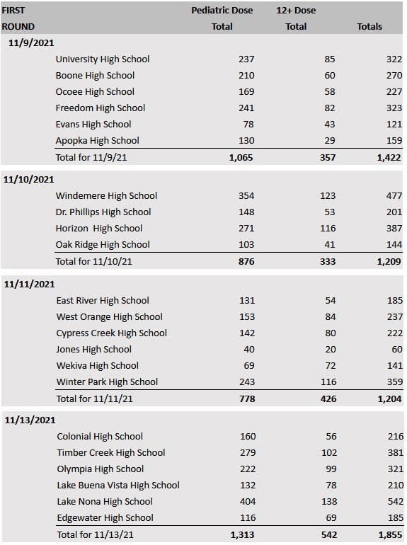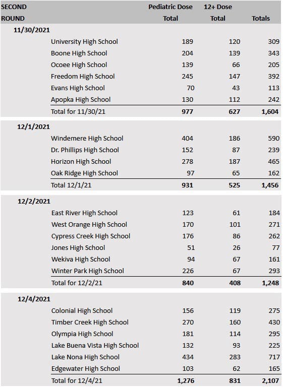 In the past month, 12,105 doses of the COVID-19 vaccine were administered during OCPS-hosted events for Orlando students, staff, their families and the community. The Orange County school district will host additional vaccination clinics in school buildings at the start of 2022. See the breakdown by school below.