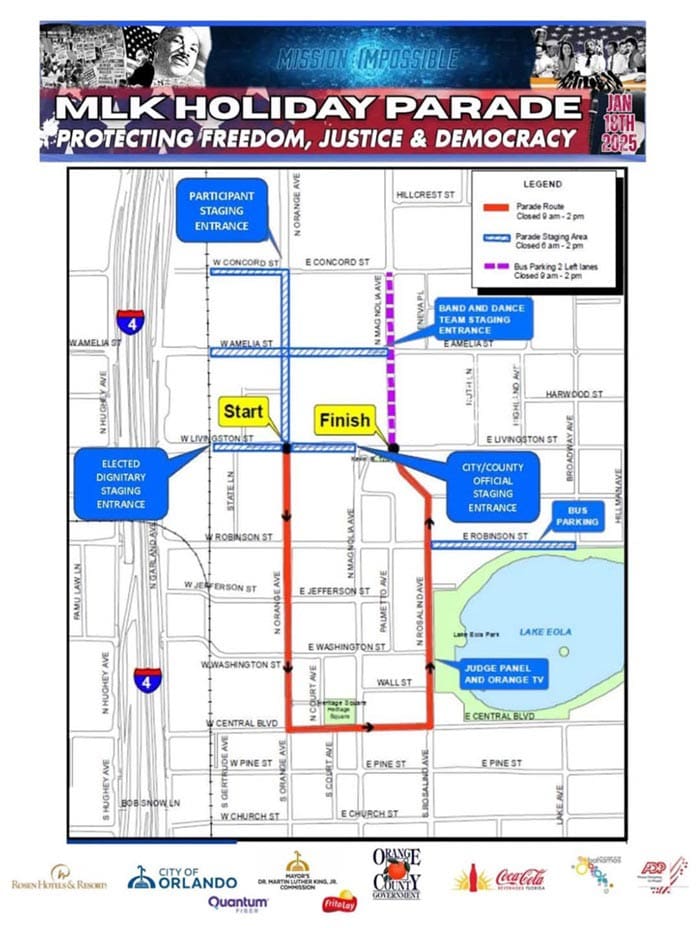 The parade kicks off at the corner North Orange Abe and Livingston Street adjacent to the courthouse. Here is the 2025 Orlando Martin Luther King Parade route map: