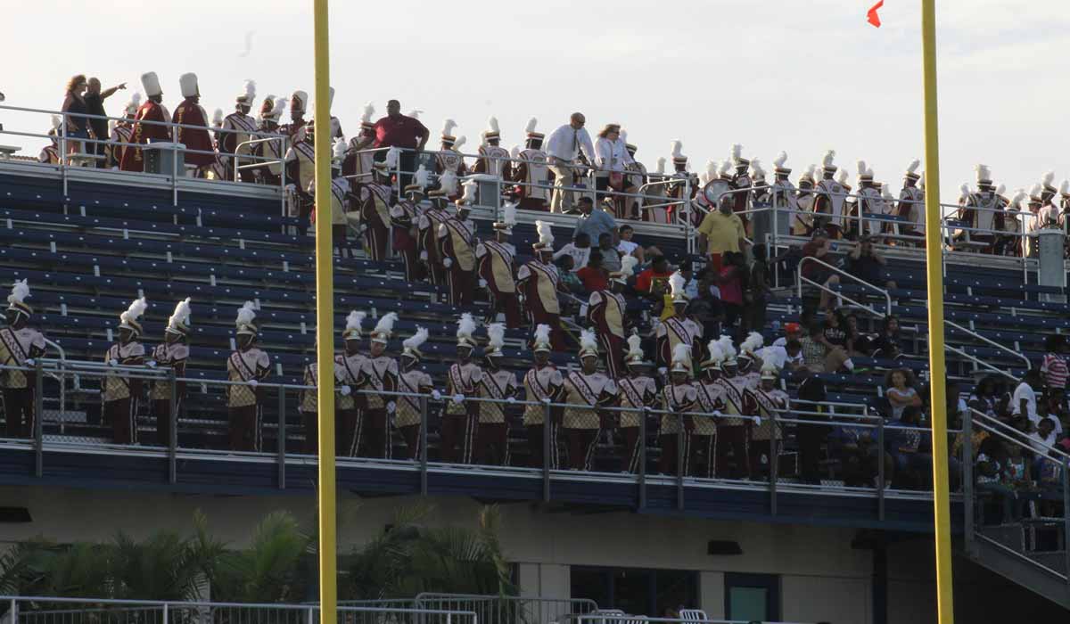 Stay with me now, I made my way to the entrance to Alphonso field at Panther stadium. The FIU band set up and put on another fanfare on field. You must respect the hard work of those band members, that’s two performances already in 90® degree heat with hats on. I remember giving Dr. Wild E. Cat some dap I know he was burning up in that uniform. As I looked to the horizon of Panther Stadium, I saw the imposing silhouette of the Marching Wildcats coming into the venue. The echo from “Let’s go Wildcats” was deafening!