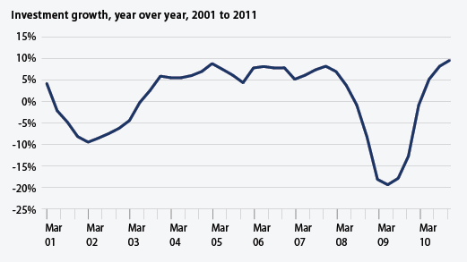1. The U.S. economy continues a moderate recovery. Gross domestic product, or GDP, grew at an annual rate of 2.8 percent in the fourth quarter of 2010, the sixth quarter of positive growth in a row. Consumption grew at an annual rate of 4.1 percent in the same quarter, which is the highest rate since the fourth quarter of 2006. Finally, year-over-year investment growth was 10 percent in the fourth quarter of 2010—the highest such growth since the fourth quarter of 2000.