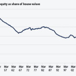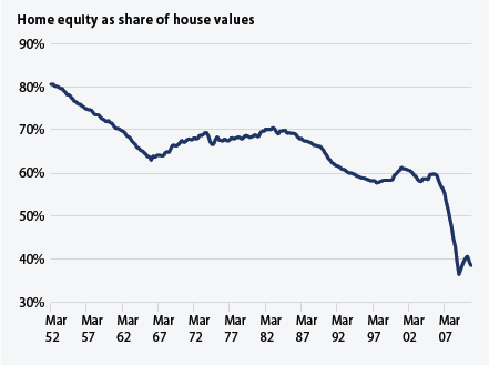 10. Family wealth losses linger. Total family wealth was down $12.8 trillion (in 2010 dollars) from June 2007—its last peak—to December 2010. This is despite an increase of $6.6 trillion in 2010 dollars from March 2009—the lowest point during the recession— to December 2010. Home equity is also recovering but homeowners on average still own only 38.5 percent of their homes. Mortgage banks own the rest.