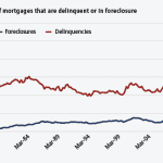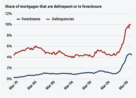 12. Mortgage troubles stay high. One in eight mortgages is delinquent or in foreclosure. The share of delinquent mortgages was 8.2 percent in the fourth quarter of 2010 and the share of mortgages that were in foreclosure was 4.6 percent. The latter is the highest share on the Mortgage Bankers Association’s records that date back to 1979.