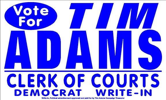 Another option for the ______ (blank) line on your ballot for Clerk of Courts is Tim Adams. After over 42 years of service and experience with the Democratic Party, Dr. Adams understands the great expense and sacrifice involved in the process. He also is quick to answer what is the best part about being a write-in candidate with “That’s an oxymoron.” And his 42 years of service and his family’s dedication to Democratic candidates in the past also make the local Democratic Party’s lack of recognition or support more of an issue for Adams.