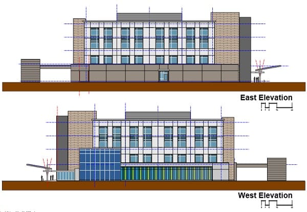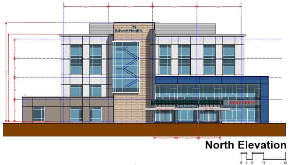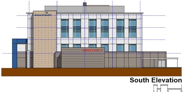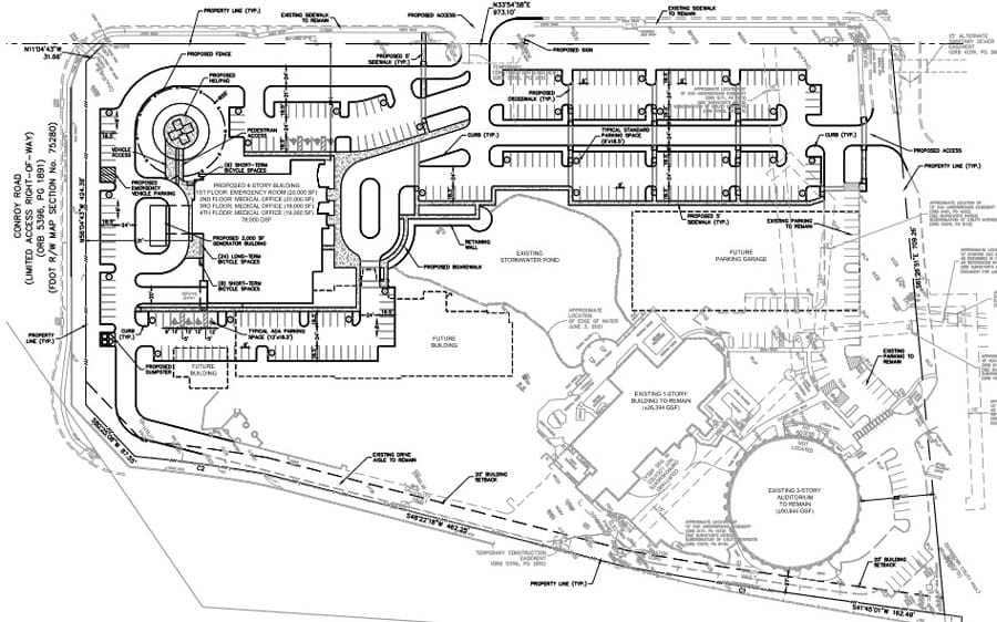 According to plans submitted to the City of Orlando, the project will be constructed in two phases. The Phase 1 improvements will consist of the 80,000 square foot building with associated parking, helipad, and the master infrastructure to serve future phases of the hospital. The proposed uses per floor are as follows: first floor will consist of a 2,000 square foot generator building and a 20,000 square foot Offsite Emergency Department, second floor a 20,000 square foot Medical Office, and a third and fourth floor at 19,000 square feet each consisting of either medical office or ambulatory surgical center. The existing stormwater management system will remain and is proposed to be used for the Phase 1 improvements. The future Phase 2 development is anticipated to contain a 5–story, 261,500 square foot hospital use.