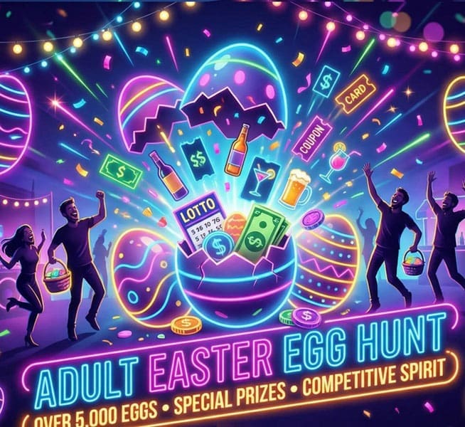 Guests will search the venue grounds for more than 5,000 hidden eggs, each packed with prizes like gift certificates, coupons, adult beverages, lotto tickets, treats, and even cash.
