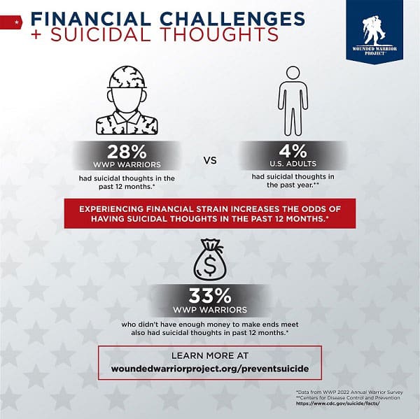 Wounded Warrior Project spotlighted the alarming prevalence of suicidal thoughts among veterans who are struggling economically. The findings underscore the importance of resources that help military veterans become self-sufficient and provide for themselves and their families.