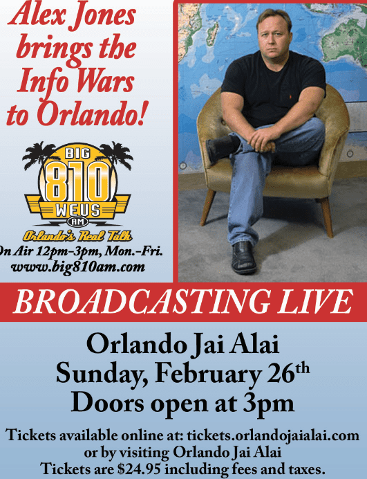 Alex Jones, brings his national radio show to the Orlando Jai Alai Fronton on 17 – 92 in Casselberry. Alex reaches over 15 million listeners on over 100 Radio Stations and his internet broadcast at infowars.com. His show is heard daily on the Big 810 AM from Noon to 3 pm. Sundays from 5 pm to 7 pm. His “blueprint to defeat the New World Order” got Alex started because of the War Out for your mind and his desire to help everyone defeat those who would steal it from you. His web sites at prísonplanet & ínfowars.com bring his message millions everyday, along with the vast number of video’s he’s produced.