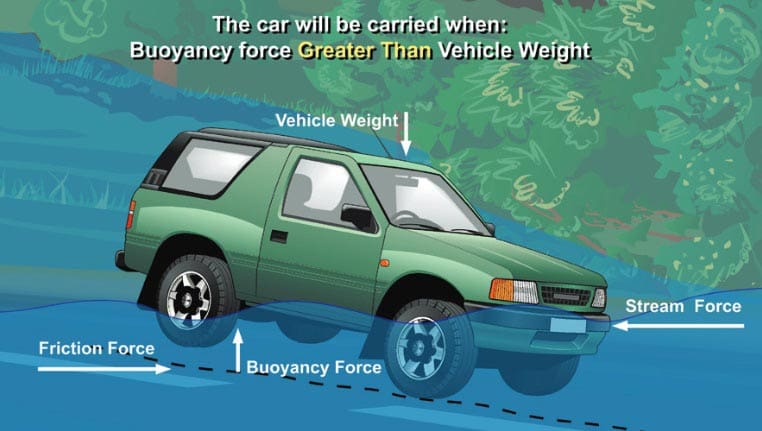 - Flooded roads could have significant damage hidden by floodwaters – NEVER drive through floodwaters or on flooded roads. Most vehicles can float away in only two feet of water.