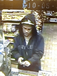 The suspect is described as a dark skin Hispanic male, about 25-30 years old, 5′ 6” – 5′ 10” tall, with black hair and a goatee. The man wore prescription glasses, a cap with the letter “C” and a dark jacket with the letters “ENYCE.”