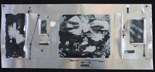 Felicia’s metallic photographs on aluminum flashing are an exploration of these ideas while haunting concerns beg attention beyond skin surface. Described in her words: The face is merged with the leaves because we all are dependent on nature. If nature did not exist we would all die. We may think we need technology and it can be a blessing but we come from the womb of nature. How quickly can nature keep up with technology? If we move too fast, can nature adapt? Are we destroying our connection with nature that is necessary for our existence? Has man chosen to be symbiotic or parasitic creature where nature is concerned? Can we find a desirable balance?”
