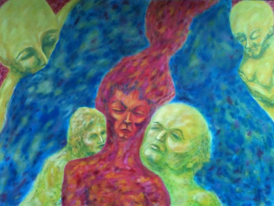 The people in her paintings fit together like a puzzle because like a puzzle, people must decide how to fit together. She subscribes to the philosophy that there is harmony in fitting but there is always conflict and difference, represented by contrasting colors. Taking elegance to heights, colors are appealing while diversity merges symbiotically onto other figures, showing each person is affected by the other.