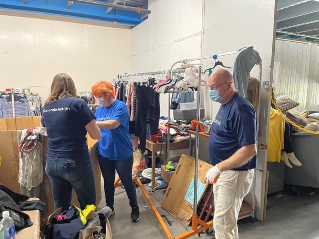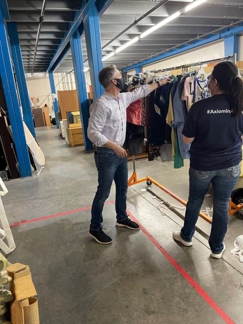 George Albuquerque, Tracy Barry, Dan Davis, Monique Doherty, Kelly Edwards, Karin Morrell, Dave Nadler, Carrie Jo Osborne and Ron Strand-Sorrell spent several hours last month sorting clothing, artwork and furniture that had been donated to the nonprofit organization. The team also donated clothing essentials, including socks and underwear, that had been collected internally by the Axiom Bank staff.