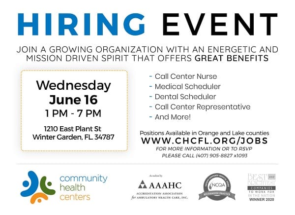 Community Health Centers, Inc. is hosting a hiring event for various positions in their call center on Wednesday, June 16th, from 1:00 p.m. – 7:00 p.m. at 1210 E. Plant St., Winter Garden, FL 34787. There will be on-site interviews for open full-time positions, including Call Center Nurse, Medical Scheduler, Dental Scheduler, Call Center Representative, and more.