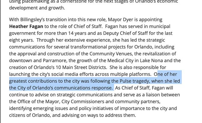 Heather Fagan was later rewarded by Mayor Buddy Dyer with one of the highest-paying position within the City of Orlando, with the City citing her role in managing the City’s public messaging after Pulse as one of her “greatest contributions.” In reality, her actions actively concealed the truth and denied the public and victims/survivor critical information about safety failures at Pulse.