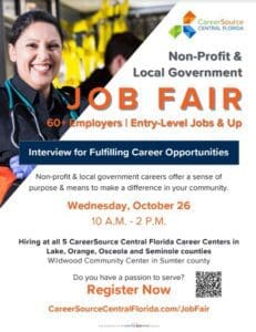 CareerSource Central Florida, Florida’s second largest workforce board, announced it will host a Non-Profit & Local Government Job Fair on Wednesday, October 26th, which is designed to bring immediate job opportunities to those who have a passion to serve in our communities. Career opportunities include, police officer, Park Ranger, Warehouse Clerk, facilities operations, HVAC tech and more.