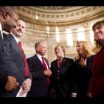 NASA Administrator Charles Bolden, third from left, introduces Edward Moore Kennedy III, fourth from left, to NASA Astronaut Leland Melvin, left, and former NASA Astronaut Scott Altman, second from left, as Edward’s mother Kiki Kennedy, wife of Edward M. Kennedy Jr. and NASA Deputy Administrator Lori Garver, right, look on at an event recognizing the 50th anniversary of the inauguration of John F. Kennedy as President of the United States, Thursday, Jan. 20, 2011 in the rotunda at the U.S. Capitol.