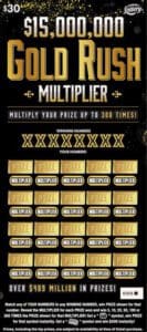The $30 scratch-off game, $15,000,000 Gold Rush Multiplier, launched in September and features four top prizes of $15 million and six prizes of $1 million. This game also features more than $489 million in total cash prizes. There are two top prizes remaining according to the Florida Lottery.