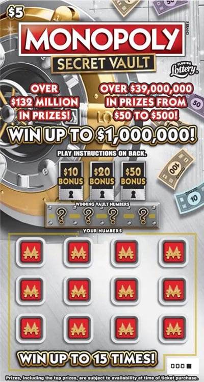 Turn $5 into $1 million playing the $5 Monopoly Secret Vault. There are three top prizes remaining according to the Florida Lottery.