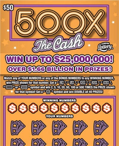 The $50 500X The Cash scratch-off game features a top prize of $25 million, the largest ever offered on a Florida scratch-off game, and the best odds to become an instant millionaire. There is one top prize remaining and 45 $1 million prizes remaining according to the Florida Lottery.
