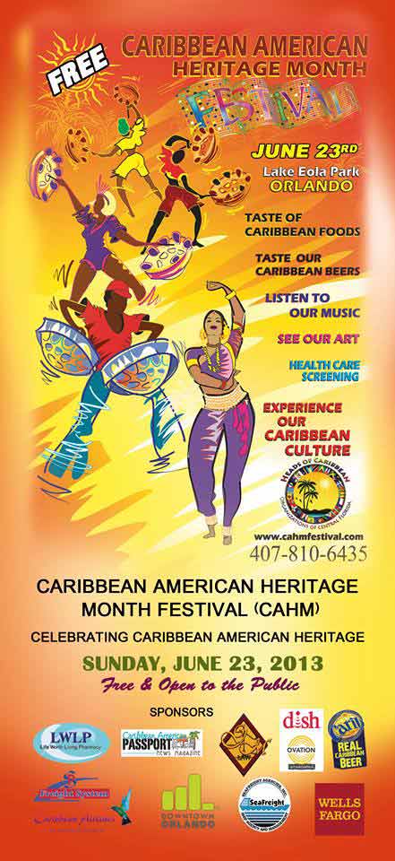 Sunday June 23rd, 2013, the Caribbean Community in Central Florida will be celebrating Caribbean American Heritage Month. This celebration will be held at Lake Eola with a free family festival that brings people together from all races, classes and creeds in a celebration of the Caribbean with musical styles of Soca, Reggae, Calypso, Zouk and revelry together with Caribbean flavors!