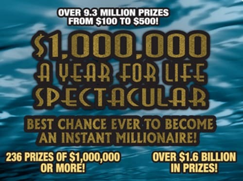 The $50 scratch-off game, $1,000,000 A YEAR FOR LIFE SPECTACULAR, features two top prizes of $1 million a year for life and 234 prizes of $1 million. Additionally, this ticket is filled with more than $1.6 billion in cash prizes.