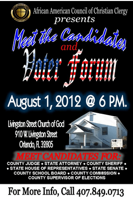 It’s time to “Meet the Candidates” during the third installment of the Voter Education Forum, which is hosted by the African American Council of Christian Clergy in collaboration with the Livingston Street Church of God. This event is scheduled for Wednesday, August 1, 2012 @ 6:00 p.m. at 910 W. Livingston Street, Orlando, FL 32805.