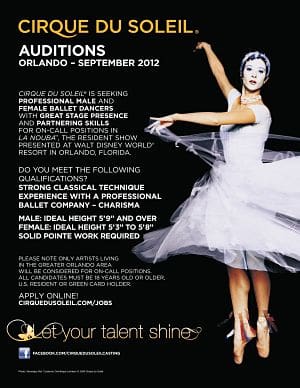 Cirque du Soleil is seeking new talent for on-call positions in La Nouba, the resident show presented at Walt Disney World® Resort and will be holding auditions for dancers in Orlando in September 2012.
