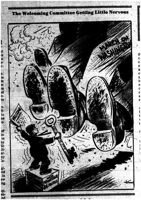 But the conservative Sentinel was clearly afraid of the March. It ran an editorial cartoon of huge Marching feet bearing down on Washington as Kennedy quivered on his political soap box.