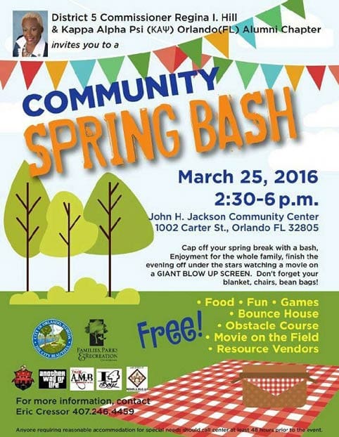 Orlando City Commissioner Regina Hill and the Kappa Alpha Psi Orlando Alumni Chapter will host a community event to “cap off your spring break with a bash.” The Spring Bash will take place on March 25th at the John H. Jackson Community Center (1002 Carter Street) from 2:30-6pm.