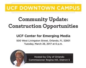 The community meeting will also include information on upcoming contract and bid opportunities. City Commissioner Regina Hill is hosting the meeting as it falls within District 5. The focus of the meeting seems to be on construction opportunities – since poor and minority residents will continue to be pushed out of their own community in order for UCF to move in, it appears the hope is that some will at least get temporary construction jobs before they go. The previous District 5 Commissioner, Daisy Lynum, made it clear the City of Orlando wanted minorities out of Parramore.
