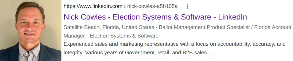 In the entire state of Florida, ES&S said they only have a team of nine full time employees dedicated to supporting all of their accounts here, and Nick Cowles appears to be based in Satellite Beach, Florida. Even with nine Florida employees, it was somehow Nick Cowles who led the Orange County training – keeping it all in the Cowles family.