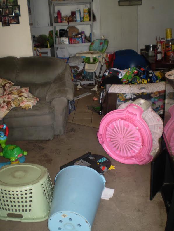There were 7 adult pit-bull dogs and 8 pit-bull puppies inside and outside the home, dog feces in the living areas (next to children’s toys), urine stained carpet, dirty dishes, upon which was rotting food, flies, and cockroaches, stale food on a baby’s highchair, a baggie of marijuana and smoking pipe sitting out on a living room table, marijuana in the bedroom, dead flies and cockroaches in a child’s room, dirty laundry on the floors, cluttered conditions, damaged walls, and dirty carpets, walls, and bathrooms. According to the affidavit, the odor inside the residence was overwhelming with dog feces, urine, and rotten food.