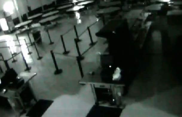 The security video shows at least two suspects, who appear to be male, in the cafeteria area. The first suspect is wearing shorts and a hoodie; the second suspect is wearing long pants and a hoodie. See video of robbery suspects below: