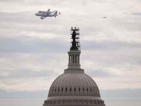 Space shuttle Discovery, mounted atop a NASA 747 Shuttle Carrier Aircraft, was flown near the U.S. Capitol, Tuesday, in Washington after departing from Kennedy Space Center in Florida around 7:00 a.m.