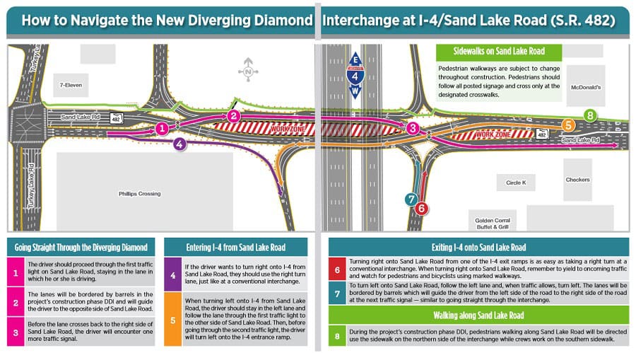 A Diverging Diamond Interchange is now reality at the Interstate 4 and Sand Lake Road (State Road 482) interchange in Orlando. The interchange is a vital gateway to one of Central Florida’s busiest tourist areas. See how to navigate it below.