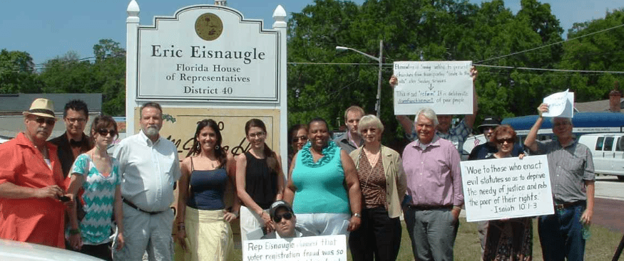 At 12:00 precisely a group of activists assembled outside of Rep. Eric Eisnaugle’s (Fla. 40) office at 2212 Curry Ford Rd. to present him with the award. Speakers Valerie Cepero, a student, Lorraine Tuliano, President of AFL-CIO Central Labor Council, Phyllis Hancock of the Central Florida A. Phillip Randolph Institute and civic activist Doug Head, former chairman of the Orange Democrats all gave their different views on voter suppression before entering Eisnaugle’s office. Eisnaugle was nowhere to be found so they dealt with his District Secretary, Edgar Robinson. They presented Robinson with the Jim Crow Legislator Award and asked that he give it to Eisnaugle. When questioned why Eisnaugle supported the bill or even if he knew what was in it Robinson evaded by not giving any direct answers instead referring to staff analysis of all legislation.