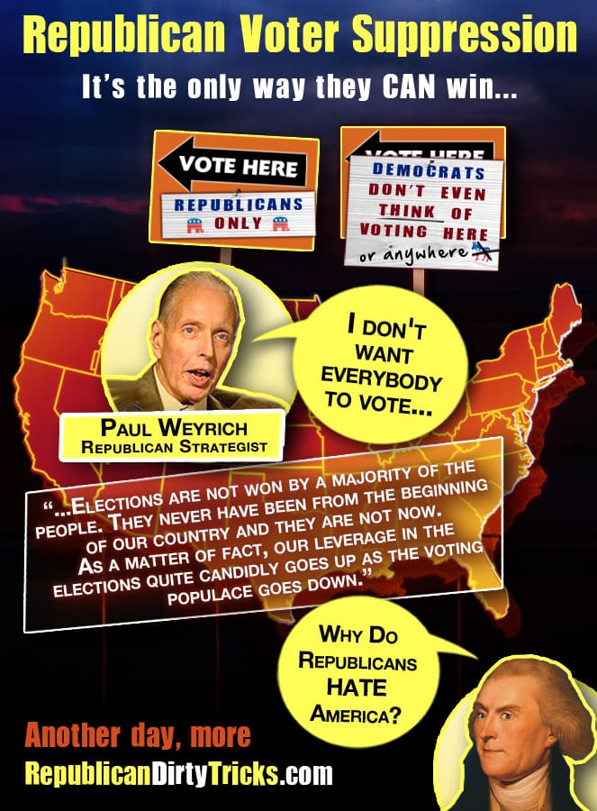 Take a real good look at this 1980 speech in Dallas before a major Religious Right gathering that also included speeches by Ronald Reagan and Jerry Falwell where Weyrich lays out the reasons for suppressing the vote. That was thirty two years ago, the year Ronald Reagan was elected and the year that the Republican long term plan to take over American politics was finally set into place. It had been in the incubator since 1955 when Milton Friedman first devised his “School Voucher” scheme in reaction to Brown v Board of Ed. Followed by and furthered along by attorney Lewis Powell, a partner in a law firm that had unsuccessfully argued against Brown. Powell’s now famous memorandum, calling for the Chamber of Commerce to be involved in local and national politics, got him placed on the Supreme Court by then President Nixon about two months after he wrote it in 1971. It took Weyrich a couple more years to put the financing into place but he convinced Joe Coors and other conservatives to invest in The Heritage Foundation which is a right wing economic and policy center.
