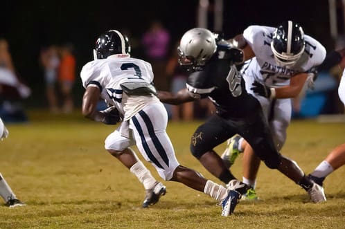 Wekiva utilized a ball control, clock chewing offense to keep the Panther offense off the field and it was effective in the early going. After the Panthers went three and out on their opening drive, the Mustangs took over in superb field position at the DP 35. Four plays later, Wekiva ran it in and converted the two point conversion for an 8-0 lead with 4:16 left in the first quarter. On the ensuing drive, DP allowed a 30-yard run by Deionte Gaines go to waste as the drive stalled at the Wekiva 37. The Mustangs assumed possession and marched 44 yards with the help of two 15 yard penalties but were forced to punt it back to the Panthers with 8:40 to go in the second quarter. From their own 12, DP’s Eric Harrell broke through the line, cut left and raced unscathed for a career-high 88-yard touchdown run.