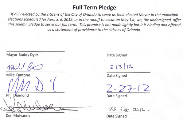 Last night, Orlando Commissioner Phil Diamond (District 1), running to unseat Dyer signed off on the pledge. Ken Mulvaney, another candidate in the Orlando mayoral race, also signed the pledge on February 23, 2012.
