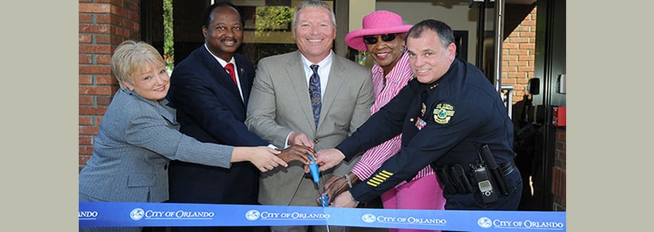 Orlando Mayor Buddy Dyer, joined with City Commissioners Daisy W. Lynum and Samuel B. Ings and Orlando Police Chief Paul Rooney, to officially open the newly relocated community police office for the southwest section of the City.