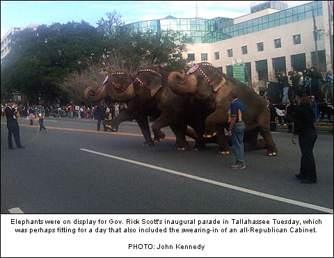 Orlando Elephants on Display for Gov. Rick Scott’s Inaugural Parade By Editor January 5, 2011 Elephants on display for Gov. Rick Scott’s inaugural parade in Tallahassee. (Photo credit: John Kennedy/The News Service of Florida) Share FacebookTwitterPinterestWhatsApp Previous articleFlorida Loses out on Millions for Uninsured KidsNext articleBlood Trail Leads to Arrest of Kissimmee Burglar Related Articles Controversial Candidate for Florida Governor Holds Event at UCF Senate Candidate Promises to Cut Costs, Crush Corruption in Florida Florida Democratic Representative Resigns, Democrats Respond LEAVE A REPLY Comment: Please enter your comment! Name:* Please enter your name here Email:* You have entered an incorrect email address! Please enter your email address here Website: Save my name, email, and website in this browser for the next time I comment. Type in the text displayed above Δ Latest Articles Orlando Briefs Controversial Candidate for Florida Governor Holds Event at UCF Politics Senate Candidate Promises to Cut Costs, Crush Corruption in Florida Crime Florida Democratic Representative Resigns, Democrats Respond Central Florida Next Phase of Regional Collaboration Begins in Four Corners Featured Columnists Advanced Radiation Therapy Offers Veterans Faster Path Through Prostate Cancer Treatment Load more Donate to West Orlando News - support local journalism and extensive public records request charges with a donation: