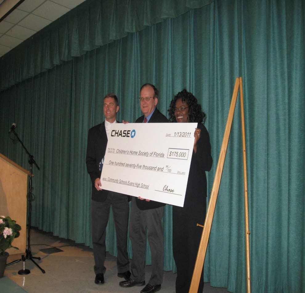 Evans High School moved closer today in realizing its vision to become a world class educational facility with the announcement of a donation of $175,000 from JP Morgan Chase to Children’s Home Society of Florida (CHS), one of several partners supporting its quest to become a full-service school.