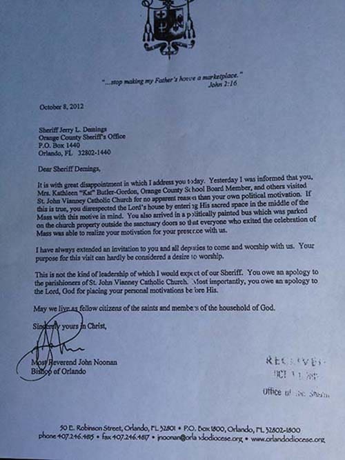 In one of Orange County’s most hotly contested races, a new Church controversy has been added to the mix in the Sheriff’s race. Bishop John Noonan of the Catholic Diocese of Orlando sent a scolding letter to Sheriff Demings after a campaign visit to St. John Vianney Catholic Church.