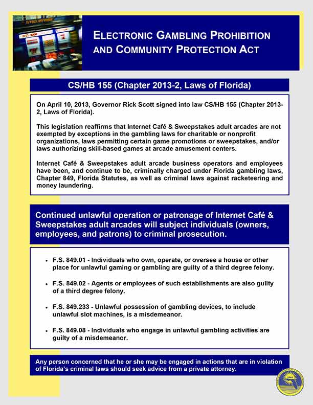 On April 10, Gov. Rick Scott signed into law the Electronic Gambling Prohibition and Community Protection Act, effectively closing down Internet Cafés and Sweepstakes adult arcades.