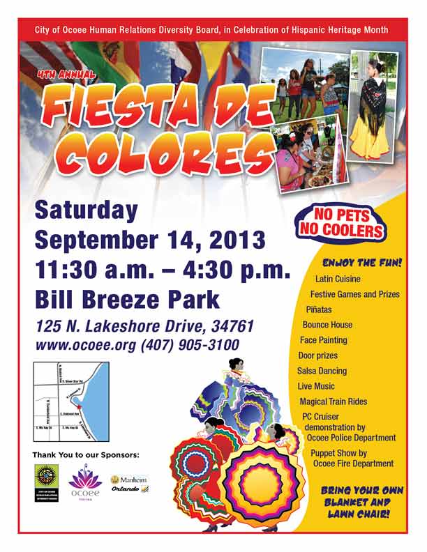 The City of Ocoee’s Human Relations Diversity Board will host its 4th Annual Fiesta de Colores on Saturday, September 14, 2013, 11:30 a.m. – 4:30 p.m., Bill Breeze Park, 125 North Lakeshore Drive.