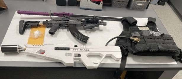 He was arrested and charged with violation of probation after detectives found a flamethrower that uses propane to project a flame of 15 feet, an AK47, additional magazines, a bulletproof vest, and narcotics in his bedroom.