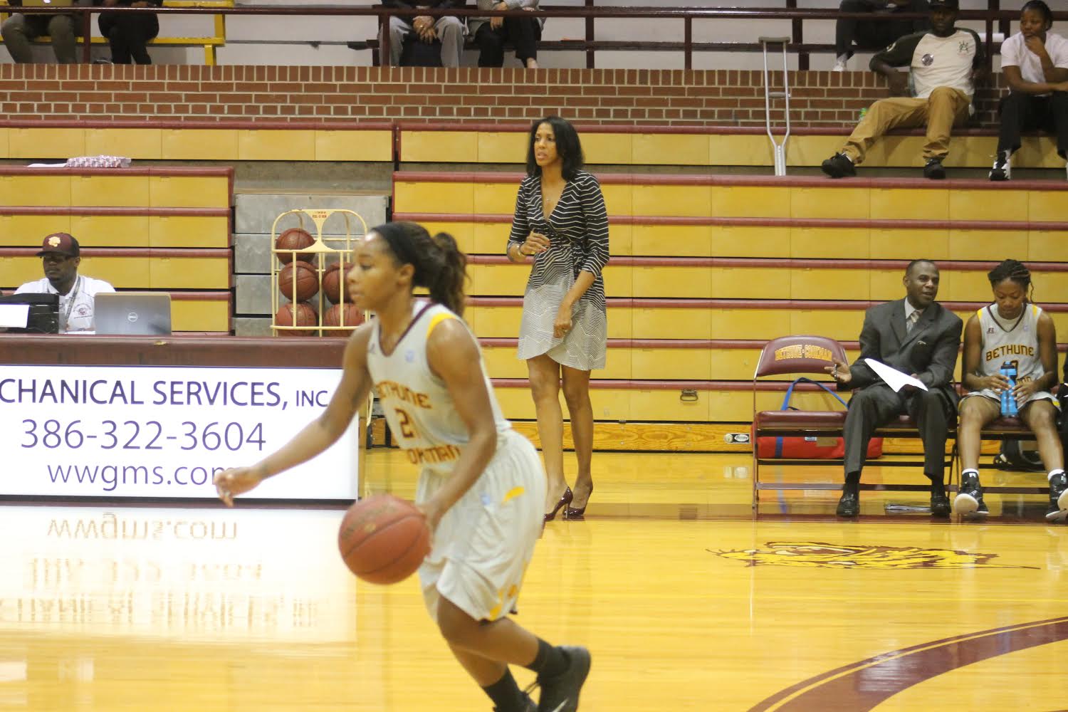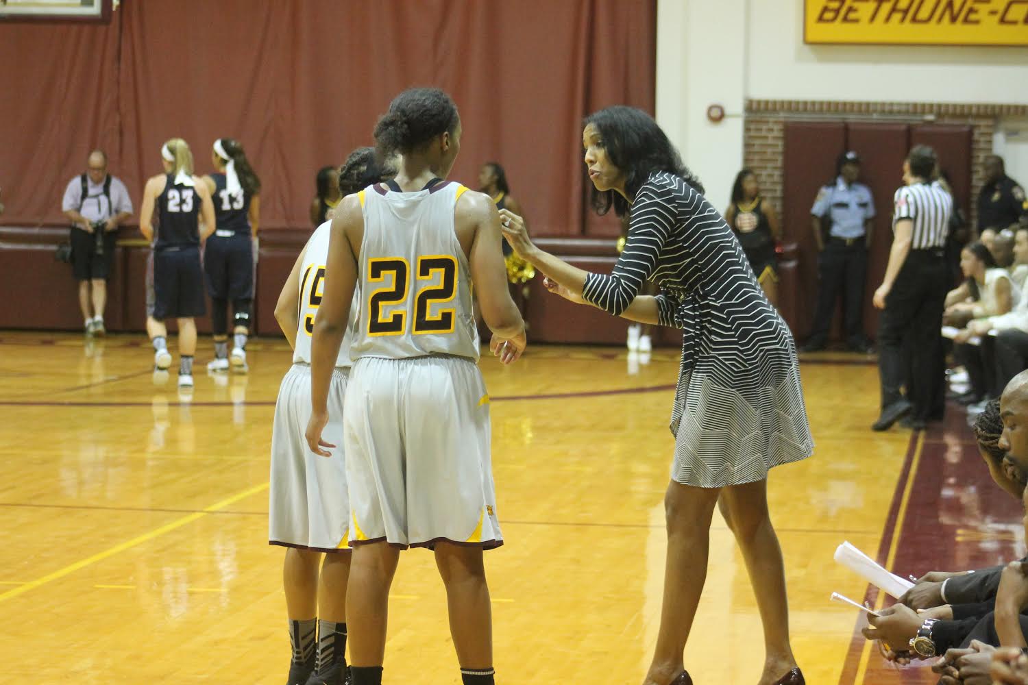 I was rather pleased with the support in the gym for a Sunday afternoon game. The Richard V. Moore gymnasium was at least half full. I just wish B-Cu would capitalize on the crowd’s energy. However, I witnessed a lot of head shaking from our fans, players, and coaches. It was not an easy game to cover. One aspect that was easy to cover was Coach Blair-Lewis, looking like she just came from the modeling runway to the sideline. If the team played as good as coach looked, the game would have been a blowout in B-CU’s favor but alas, it was not to be.