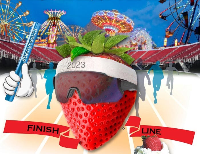 The Festival’s strawberry character featured in each year’s theme artwork is an iconic part of the event’s branding and advertising efforts. In this theme’s artwork, he wears a sweatband, waves a #BerryFest23 baton and holds a plate of strawberry shortcake as he crosses the finish line.