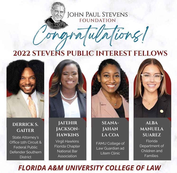 Four Florida A&M University College of Law students are recipients of the Justice John Paul Stevens Public Interest Fellowship. Alba Manuela Suarez, Jai’Ehir Jackson-Hawkins, Derrick Gaiter and Seana-Jahan La Coa received the monetary awards.