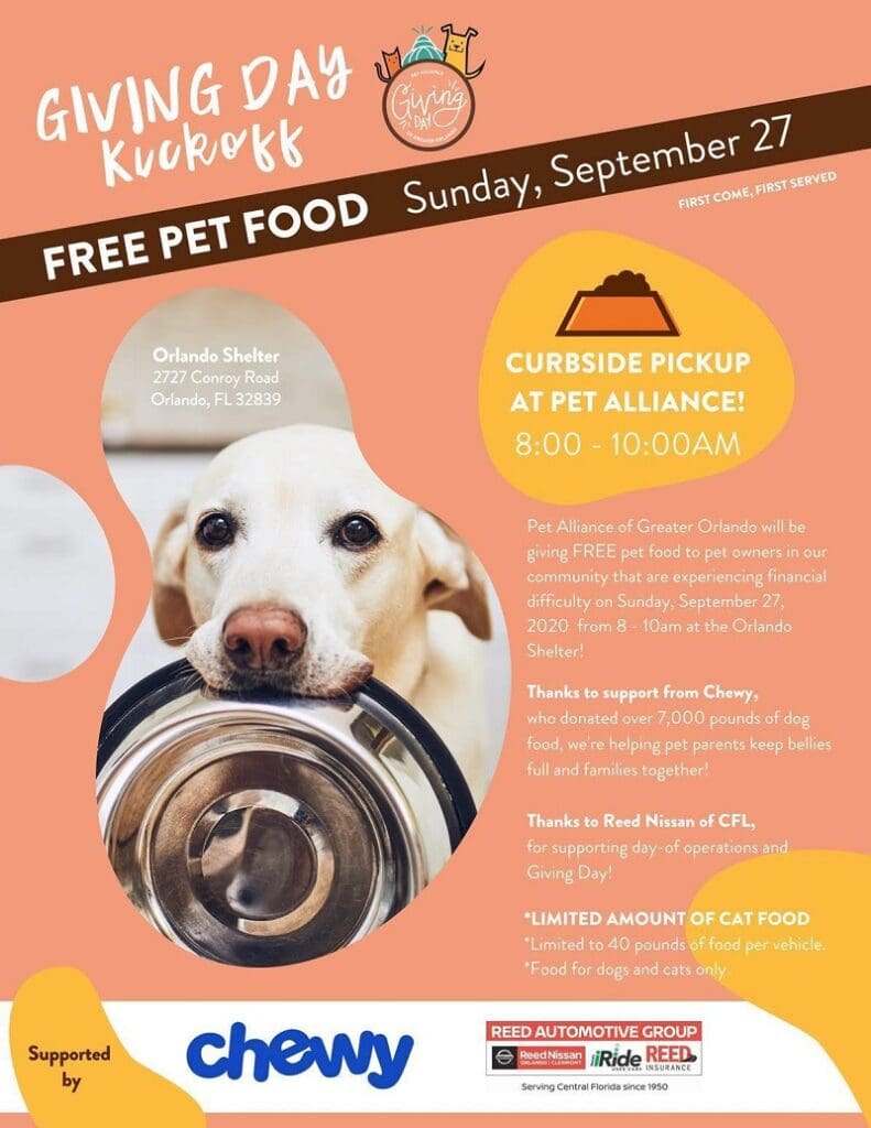The Pet Alliance of Greater Orlando, with support from Chewy and Reed Nissan of CFL, will be giving away free pet food to dog and cat owners that are experiencing financial difficulty this Sunday, September 27th. It will take place from 8am to 10am at the Orlando shelter. See the flyer below for more details, it is first come, first served.